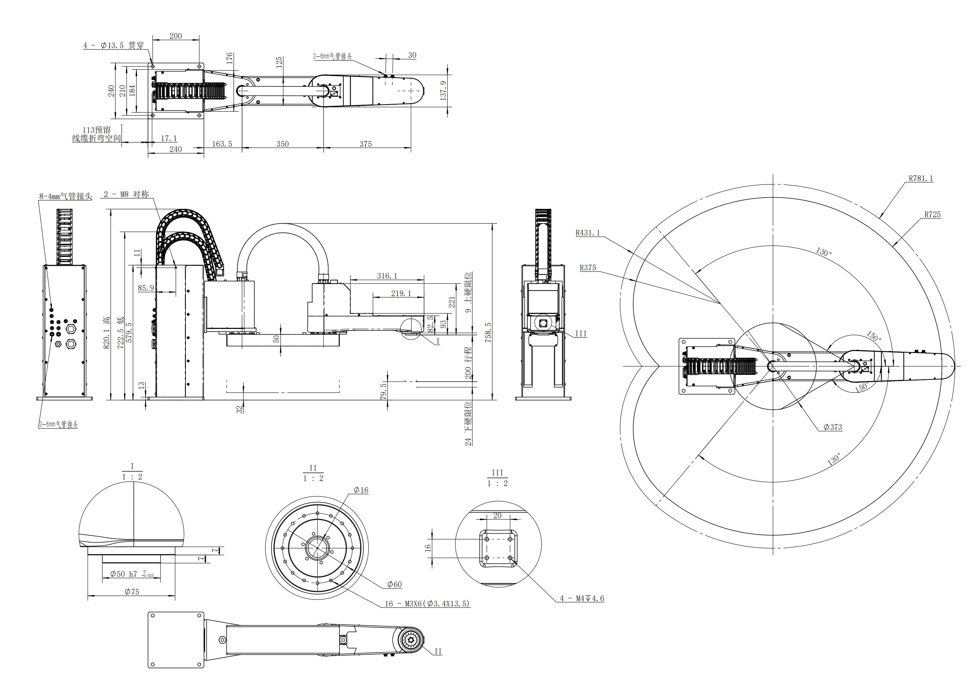 J1軸旋轉(zhuǎn)0-200mm J2軸旋轉(zhuǎn)±130° J3軸移動±150° J4軸旋轉(zhuǎn)±360°