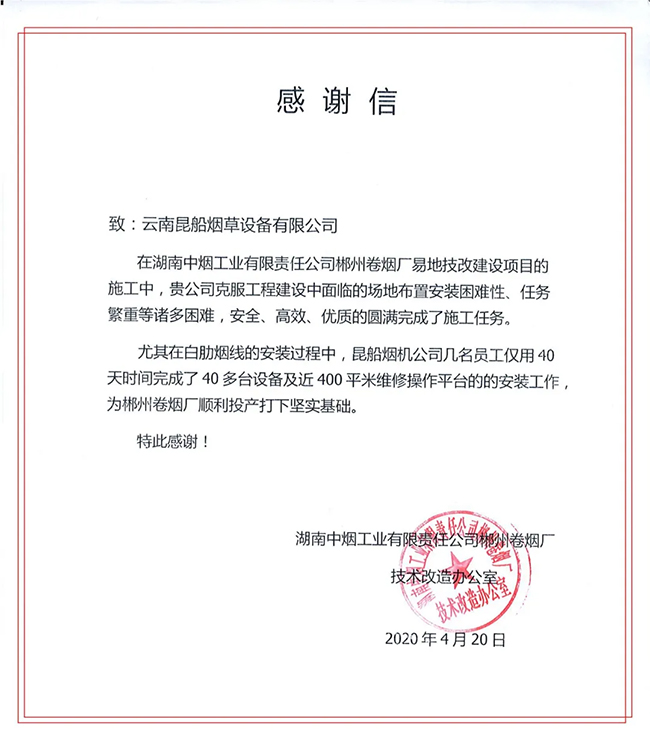 近日,中國船舶云南昆船煙草設備有限公司(以下簡稱:昆船煙機公司)收到湖南中煙工業有限責任公司郴州卷煙廠發來的感謝信,對昆船煙機公司在郴州卷煙廠易地技改建設項目的施工中排除萬難,安全、高效、優質地圓滿完成施工任務表示感謝。