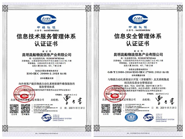 5月19日,中國船舶昆船物流公司成功取得ISO20000(信息技術(shù)服務(wù)管理體系)、ISO27001(信息安全管理體系)兩項體系認證證書。